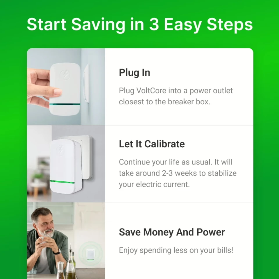 Esaver Watt immediately starts stabilizing voltage and regulating power. Within days, your home’s electrical system begins running more efficiently.